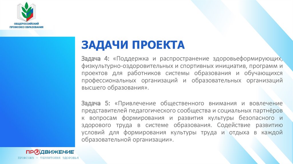 ЗАДАЧИ ПРОЕКТАЗадача 4: «Поддержка и распространение здоровьеформирующих,