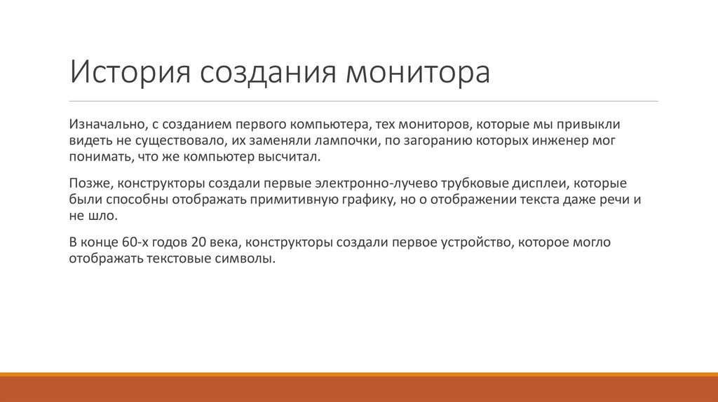 История создания монитораИзначально, с созданием первого компьютера, тех мониторов, которые мы привыкли