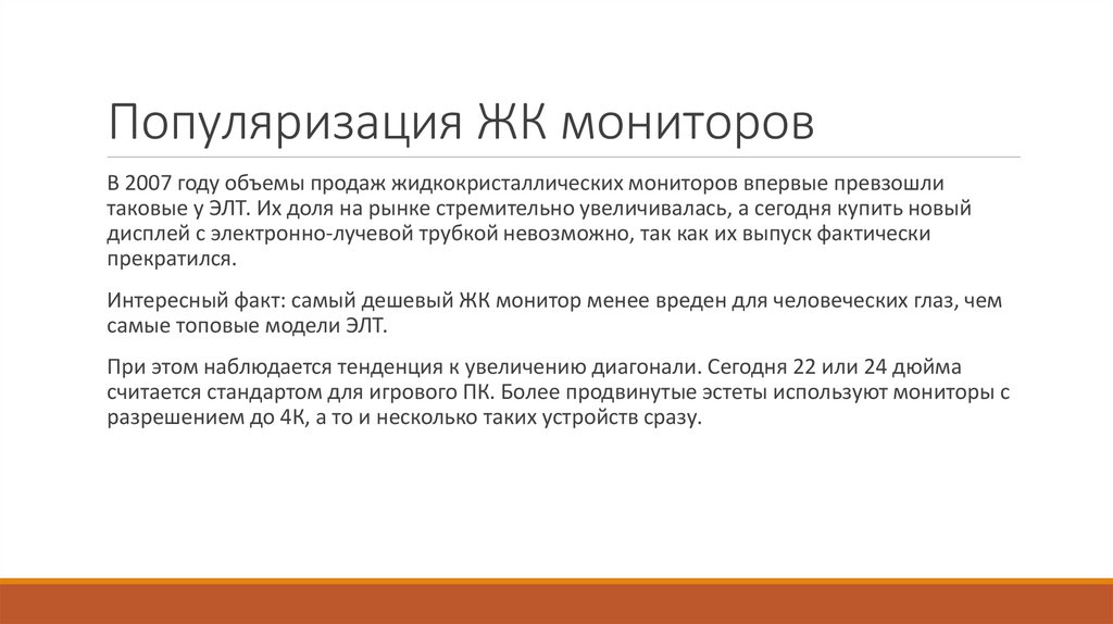 Популяризация ЖК мониторовВ 2007 году объемы продаж жидкокристаллических мониторов впервые превзошли