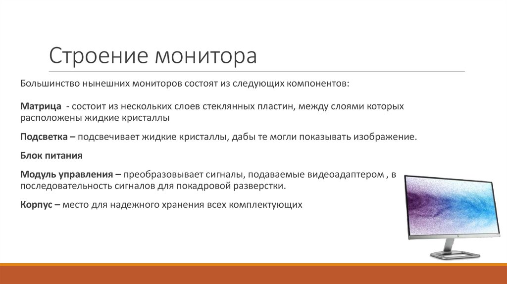 Строение монитораБольшинство нынешних мониторов состоят из следующих компонентов: