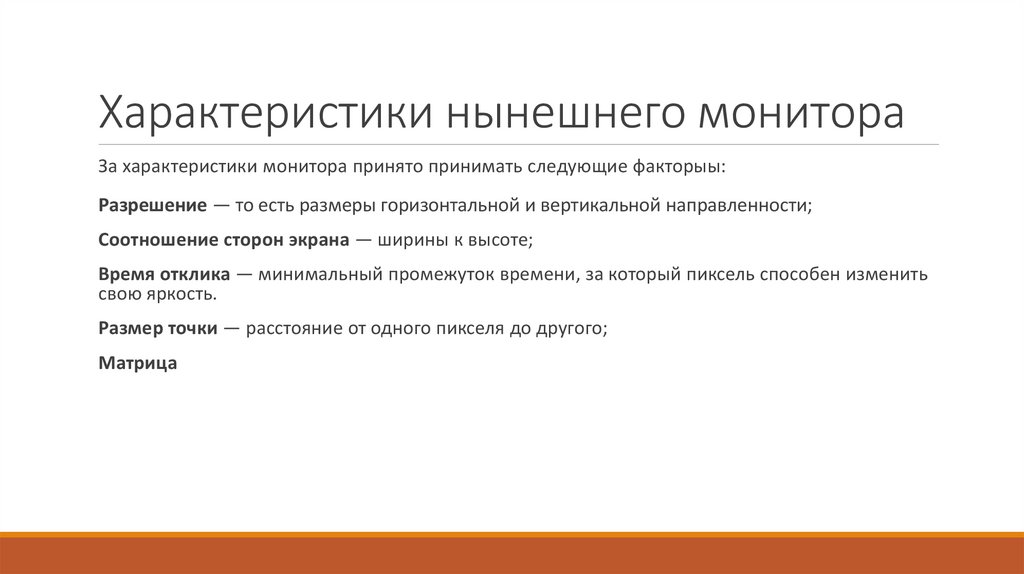Характеристики нынешнего монитораЗа характеристики монитора принято принимать следующие факторыы: