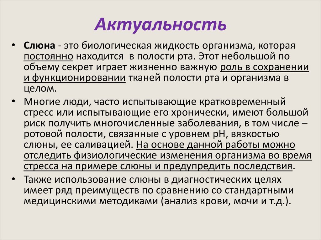 Актуальность• Слюна - это биологическая жидкость организма, которая