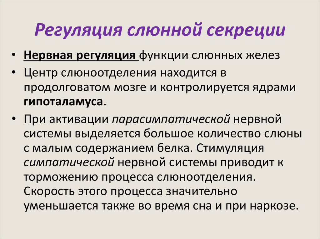 Регуляция слюнной секреции• Нервная регуляция функции слюнных желез