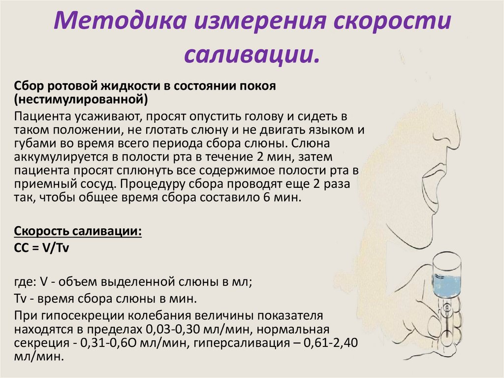 5 сек и измеряют объем слюны, вытекшей за это время. Вязкость слюны: