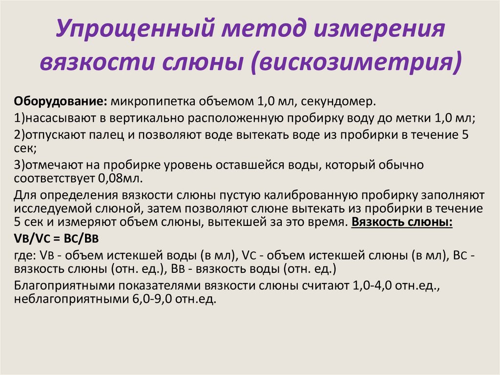 Благоприятными показателями вязкости слюны считают 1,0-4,0 отн.ед.,