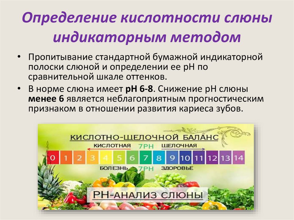 • В норме слюна имеет рН 6-8. Снижение рН слюны