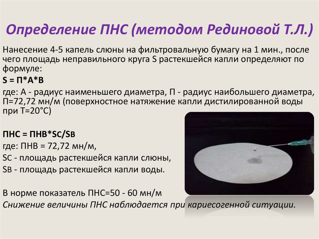 • Поверхностное натяжение слюны (ПНС) характеризует ее
