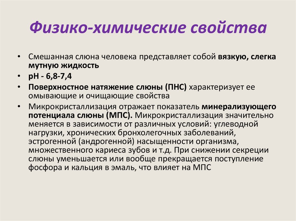 Физико-химические свойства• Смешанная слюна человека представляет собой вязкую, слегка