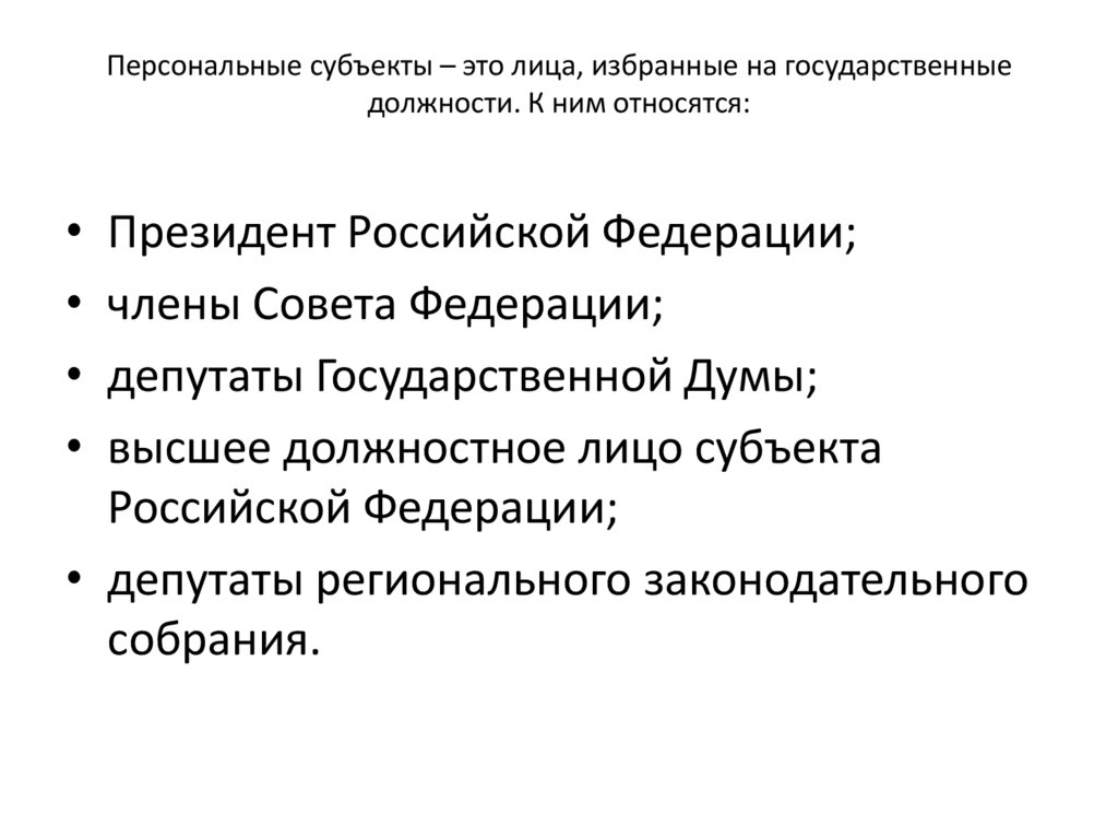 Персональные субъекты – это лица, избранные на государственныедолжности. К ним относятся: