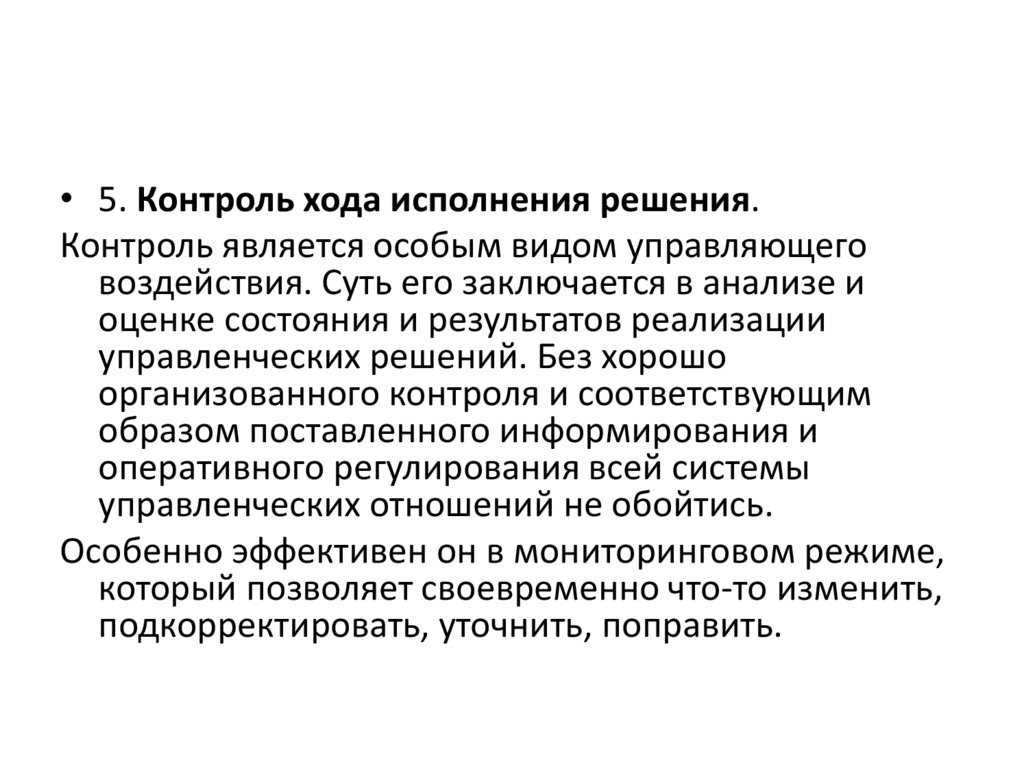 • 5. Контроль хода исполнения решения.Контроль является особым видом управляющего