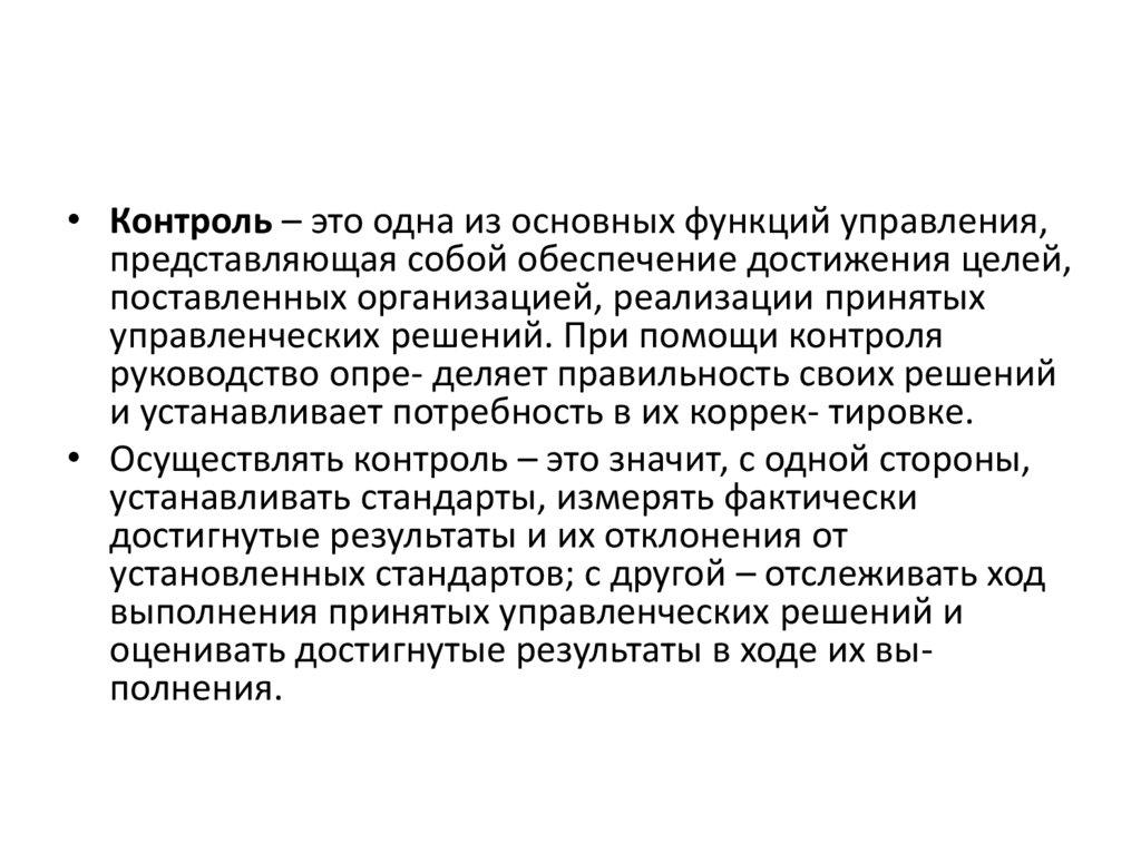 • Контроль – это одна из основных функций управления,представляющая собой обеспечение достижения целей,