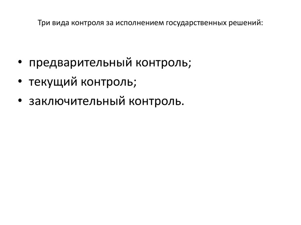 Три вида контроля за исполнением государственных решений:• предварительный контроль;