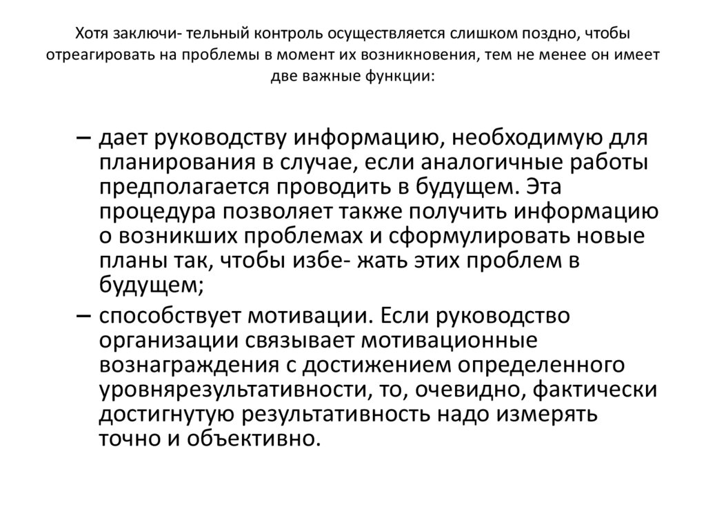 Хотя заключи- тельный контроль осуществляется слишком поздно, чтобыотреагировать на проблемы в момент их возникновения, тем не менее он имеет