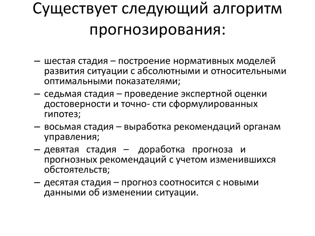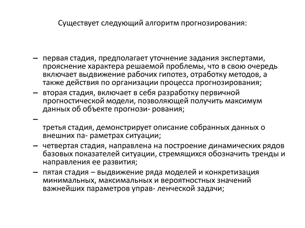 Существует следующий алгоритм прогнозирования:– первая стадия, предполагает уточнение задания экспертами,