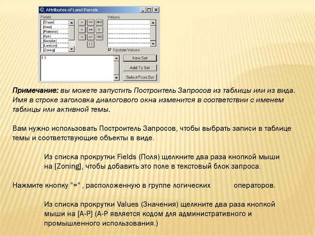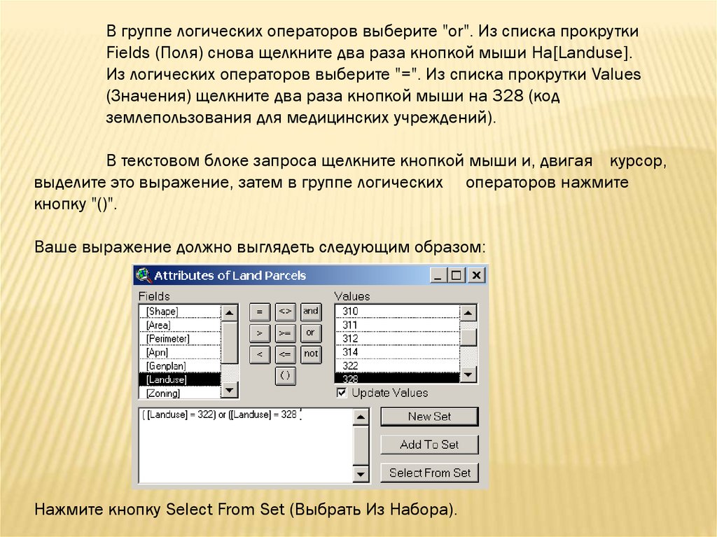 В группе логических операторов выберите "or". Из списка прокруткиFields (Поля) снова щелкните два раза кнопкой мыши Ha[Landuse].
