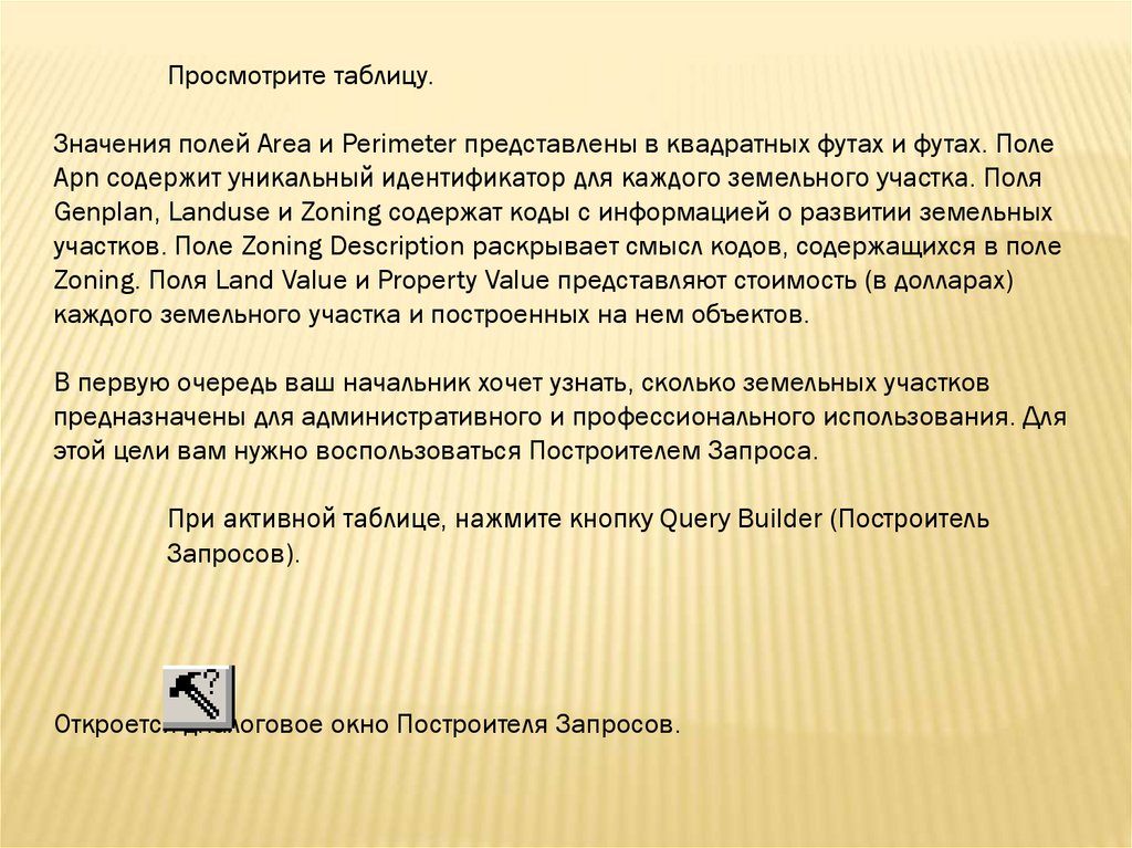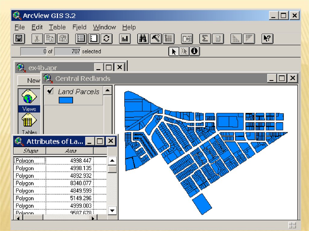 Щелкните кнопкой мыши на таблицу Attributes of Land Parcels(Атрибуты Land Parcels), чтобы сделать ее активной. Затем