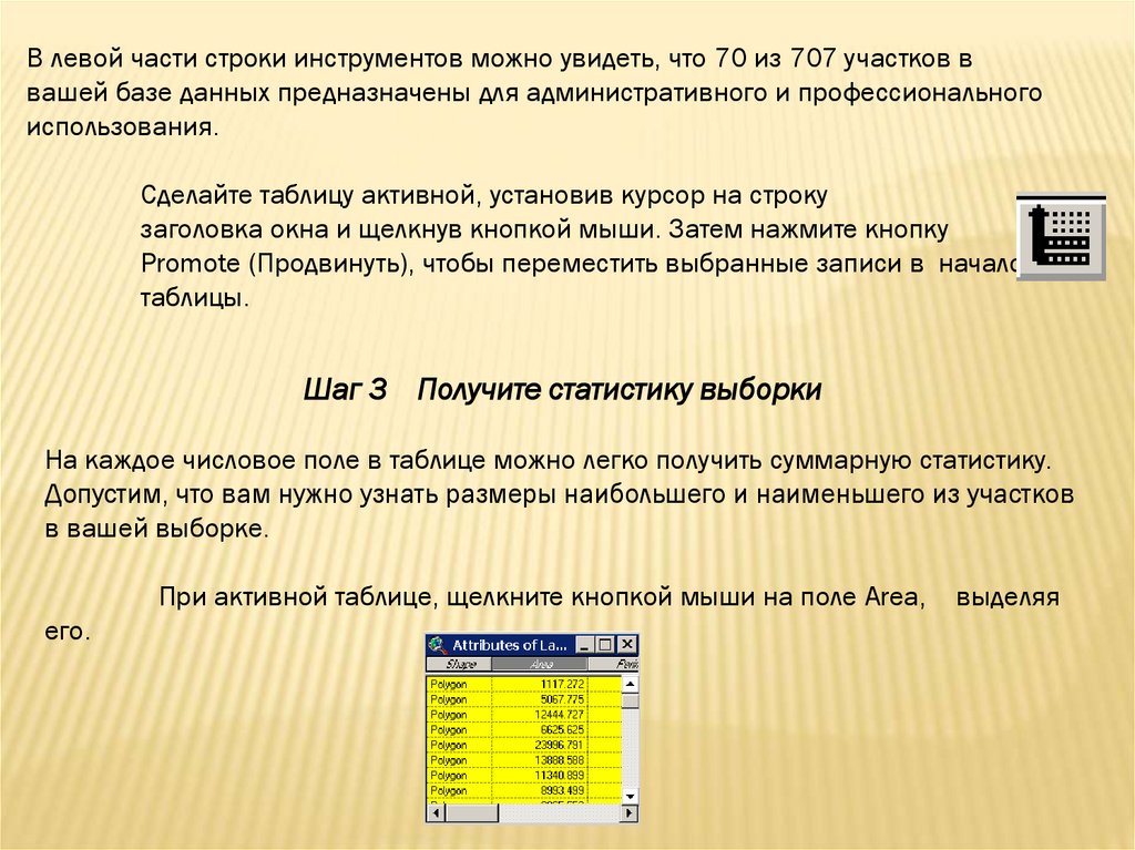ArcView сообщает подсчитанные значения общей площади выбранных участков;