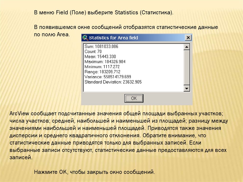 В меню Field (Поле) выберите Statistics (Статистика).В появившемся окне сообщений отобразятся статистические данные