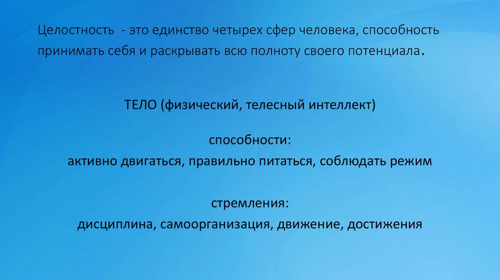 Целостность - это единство четырех сфер человека, способностьпринимать себя и раскрывать всю полноту своего потенциала.