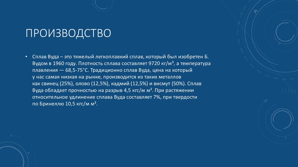ПРОИЗВОДСТВО• Сплав Вуда – это тяжелый легкоплавкий сплав, который был изобретен Б.