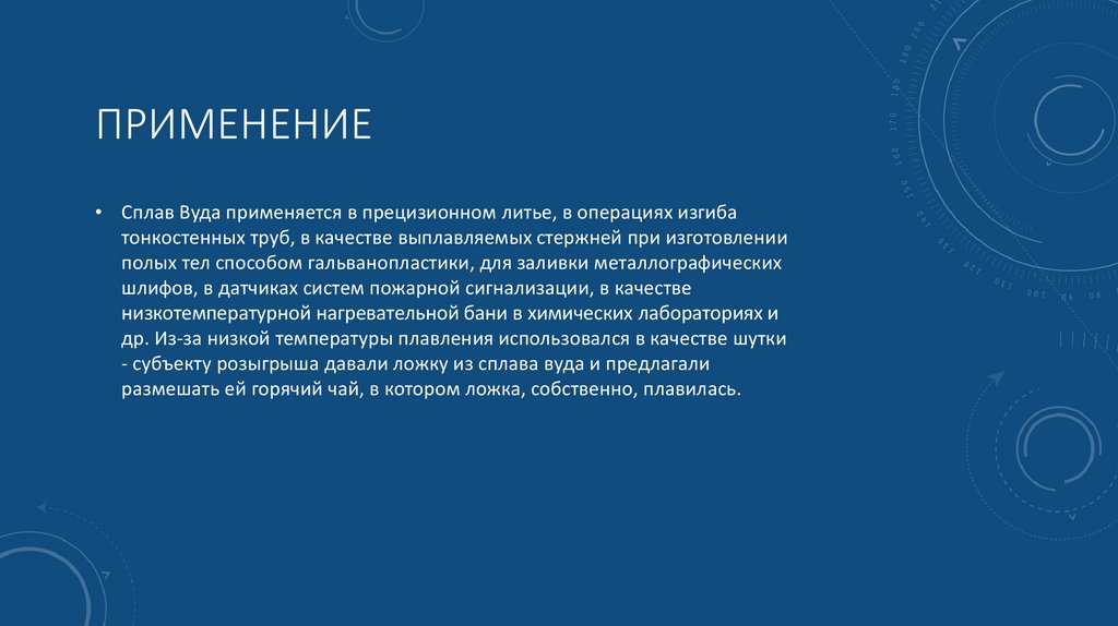 ПРИМЕНЕНИЕ• Сплав Вуда применяется в прецизионном литье, в операциях изгиба