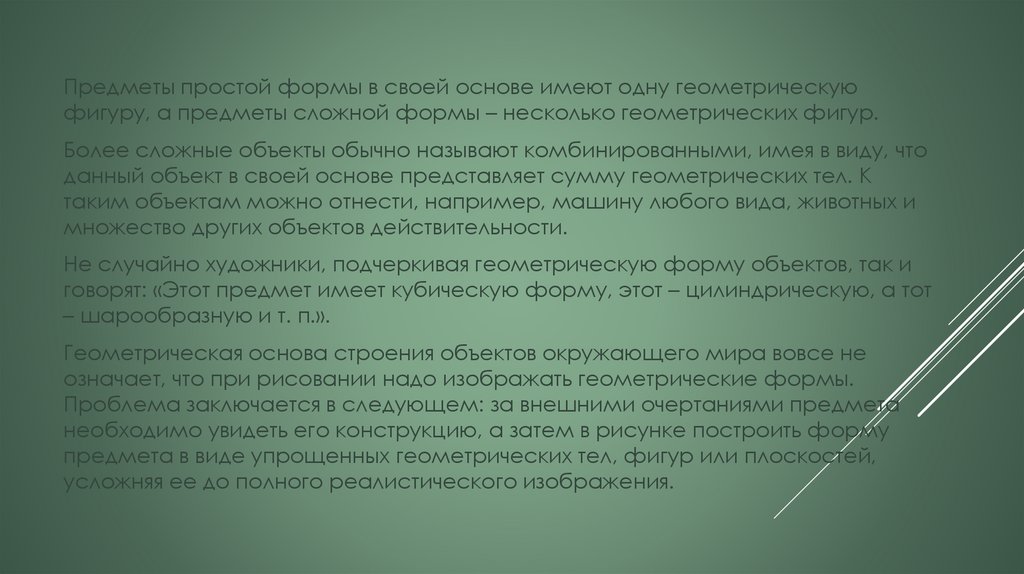 Предметы простой формы в своей основе имеют одну геометрическуюфигуру, а предметы сложной формы – несколько геометрических фигур.