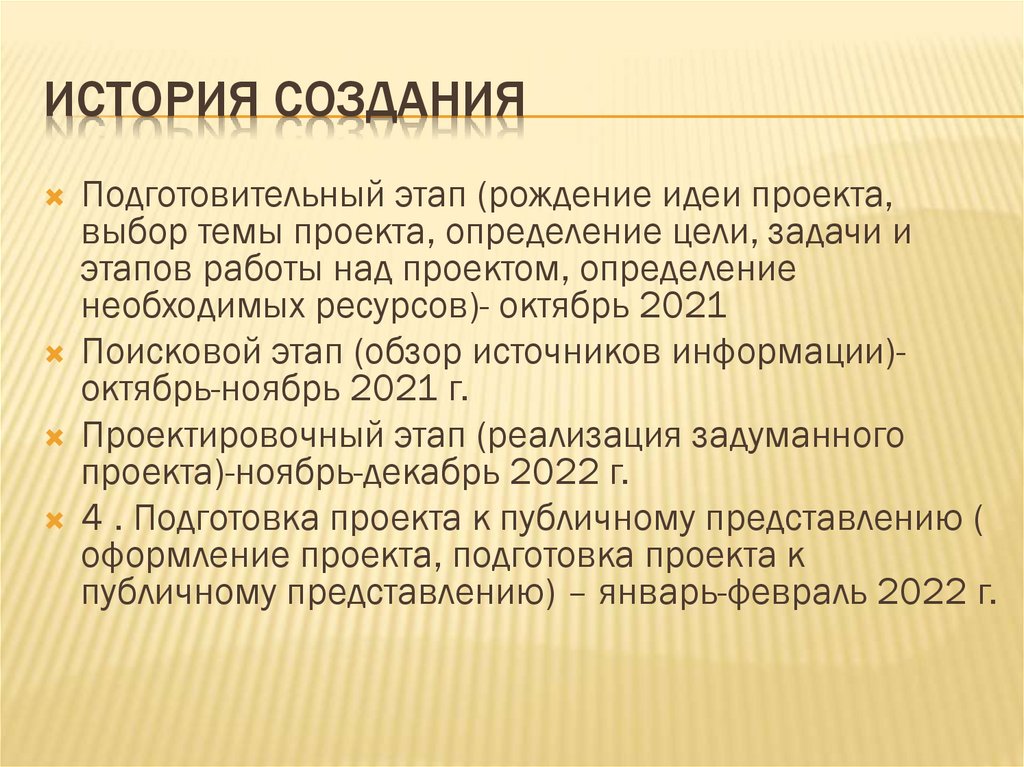 ИСТОРИЯ СОЗДАНИЯПодготовительный этап (рождение идеи проекта,