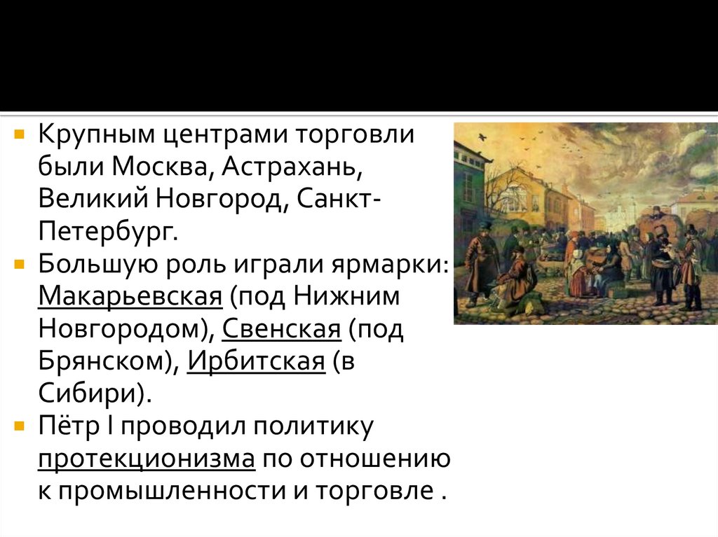 Крупным центрами торговлибыли Москва, Астрахань,
