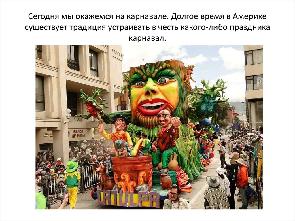 Сегодня мы окажемся на карнавале. Долгое время в Америкесуществует традиция устраивать в честь какого-либо праздника
