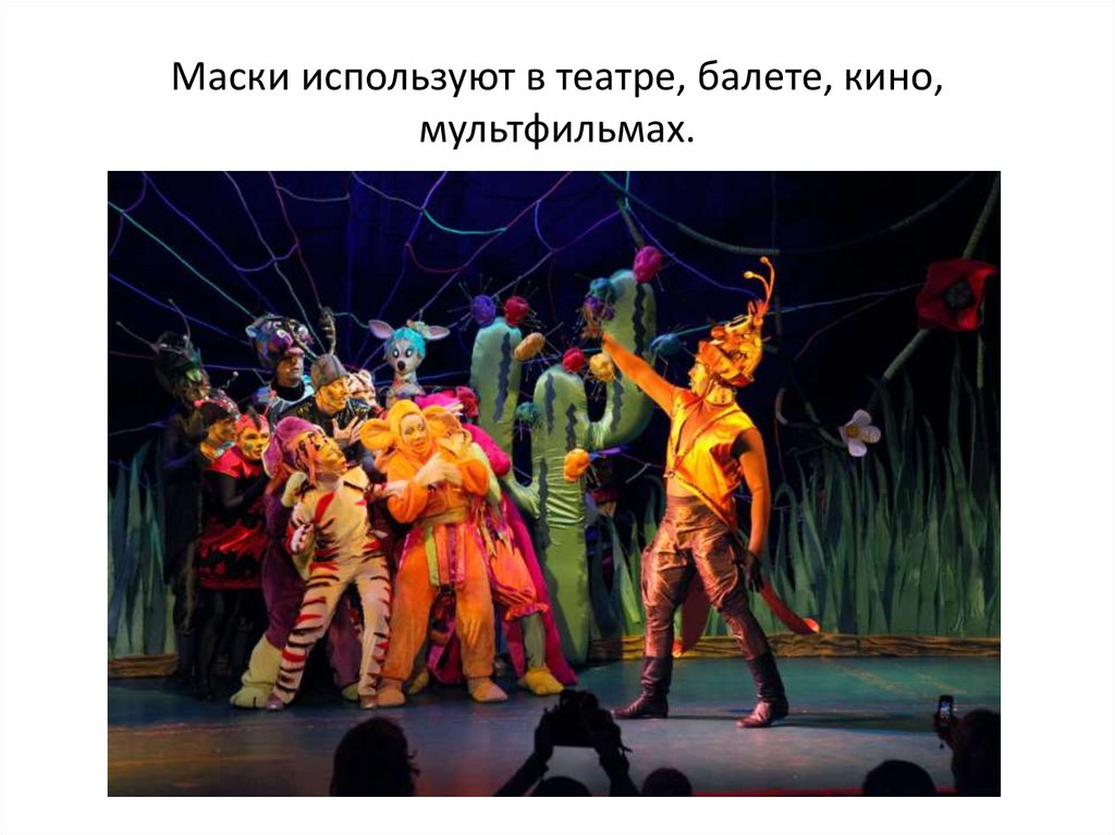 Маски используют в театре, балете, кино,мультфильмах.