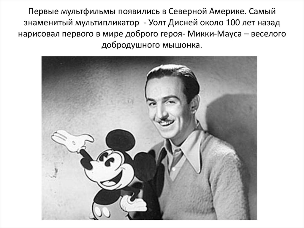 Первые мультфильмы появились в Северной Америке. Самыйзнаменитый мультипликатор - Уолт Дисней около 100 лет назад