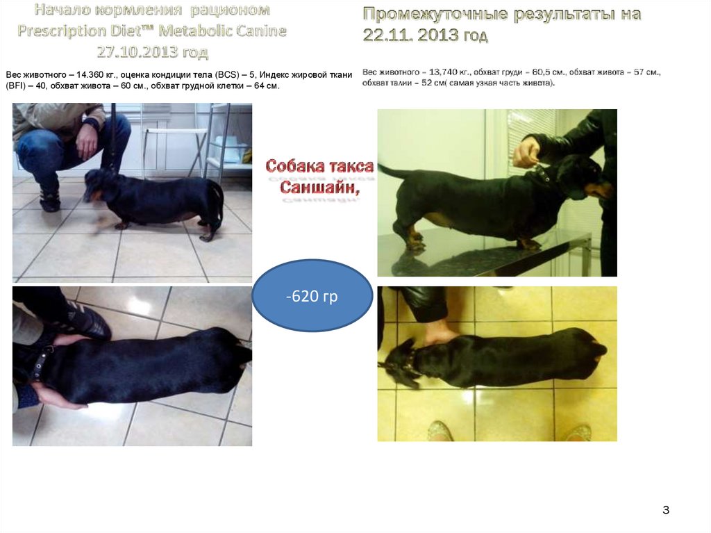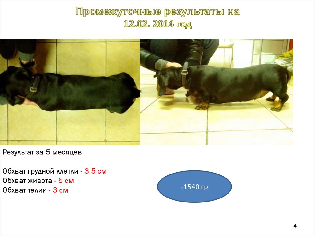 Вес животного – 14.360 кг., оценка кондиции тела (BCS) – 5, Индекс жировой ткани(BFI) – 40, обхват живота – 60 см., обхват грудной клетки – 64 см.