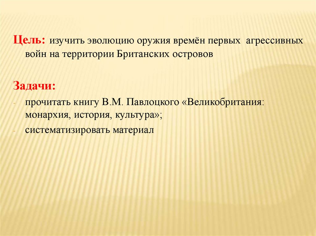 Цель: изучить эволюцию оружия времён первых агрессивныхвойн на территории Британских островов