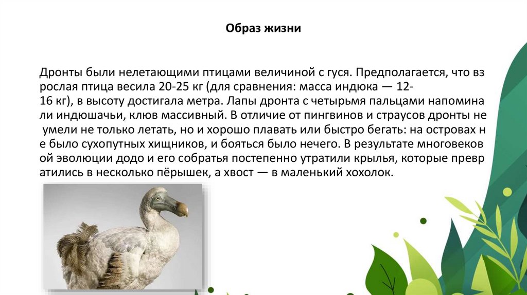 Образ жизниДронты были нелетающими птицами величиной с гуся. Предполагается, что вз