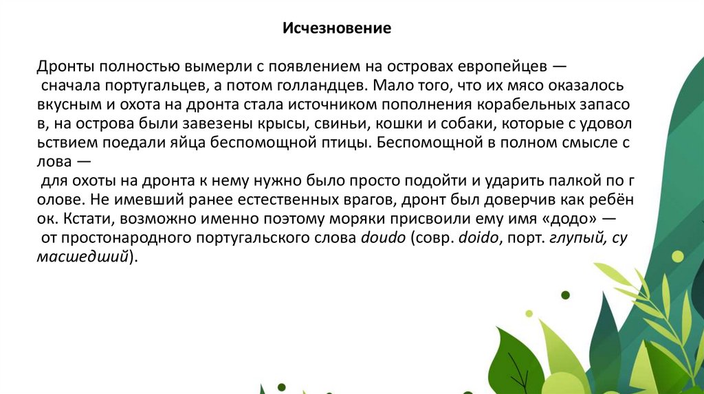 ИсчезновениеДронты полностью вымерли с появлением на островах европейцев —
