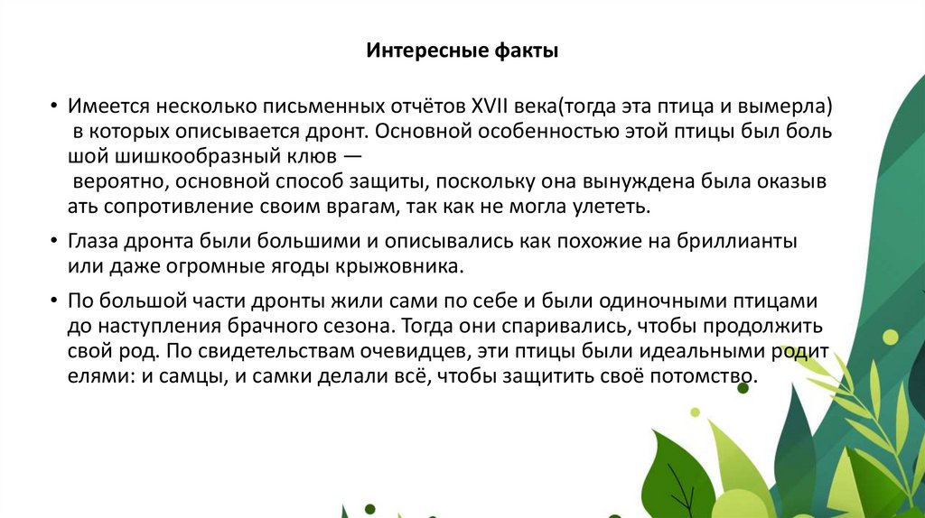 Интересные факты• Имеется несколько письменных отчётов XVII века(тогда эта птица и вымерла)