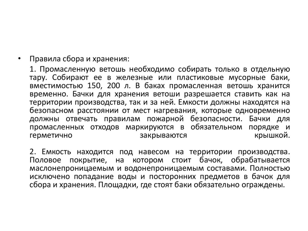 • Правила сбора и хранения:1. Промасленную ветошь необходимо собирать только в отдельную