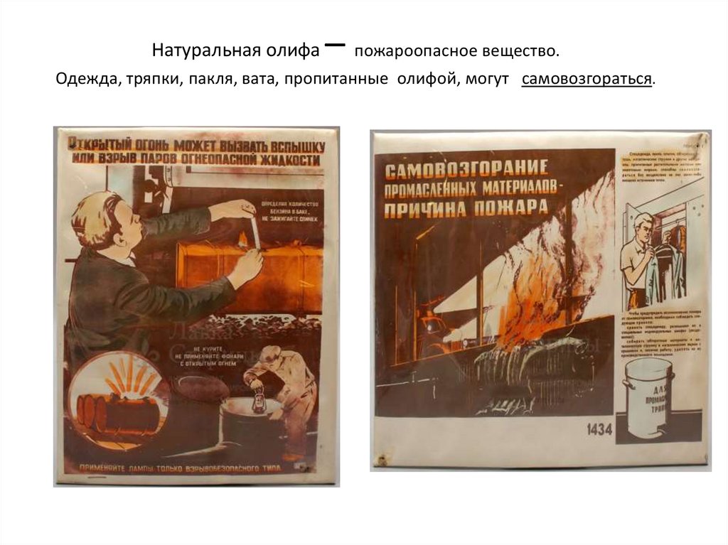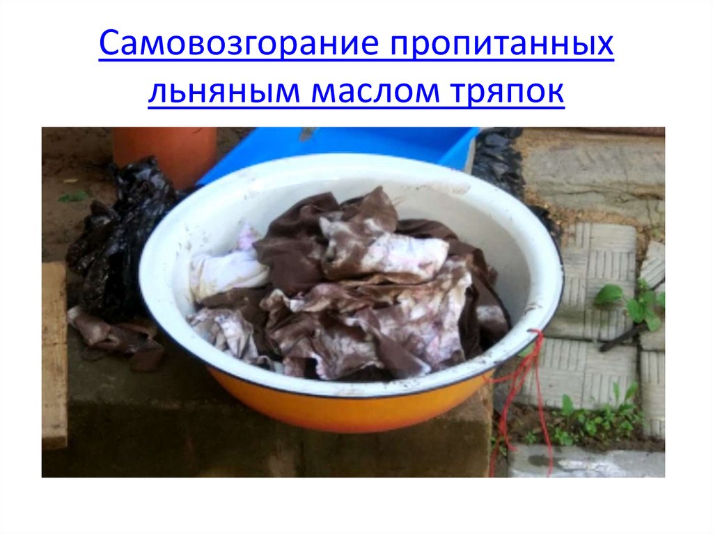 Одежда, тряпки, пакля, вата, пропитанные олифой, могут самовозгораться.