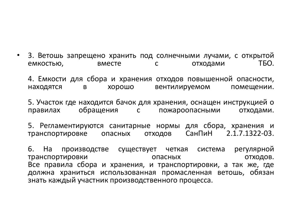• 3. Ветошь запрещено хранить под солнечными лучами, с открытойемкостью,