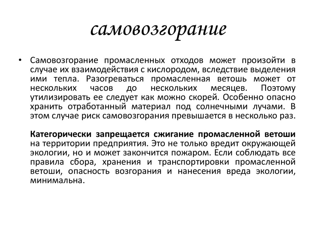 самовозгорание• Самовозгорание промасленных отходов может произойти в