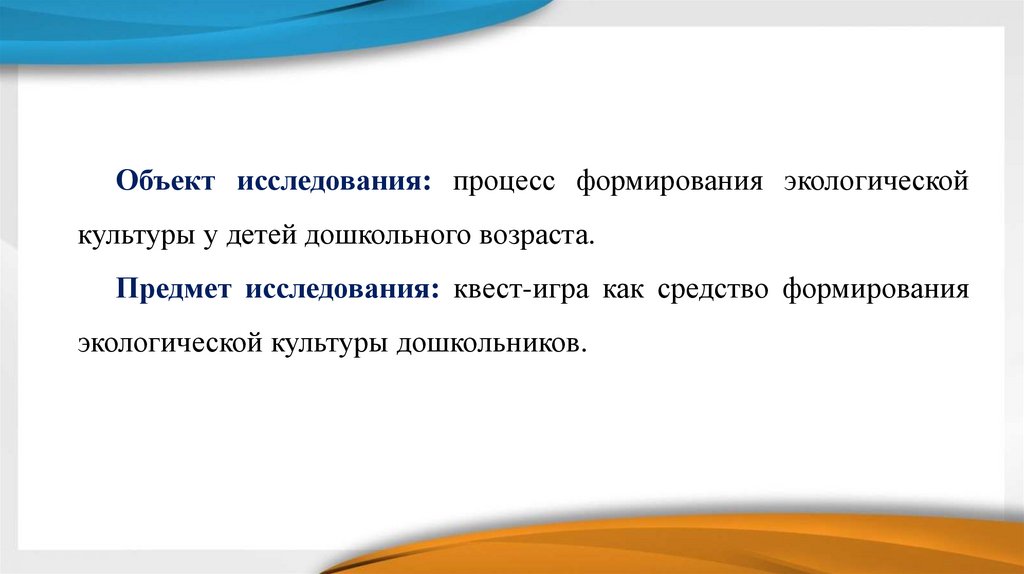 Объект исследования: процесс формирования экологическойкультуры у детей дошкольного возраста.
