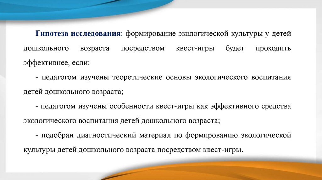 Гипотеза исследования: формирование экологической культуры у детейдошкольного