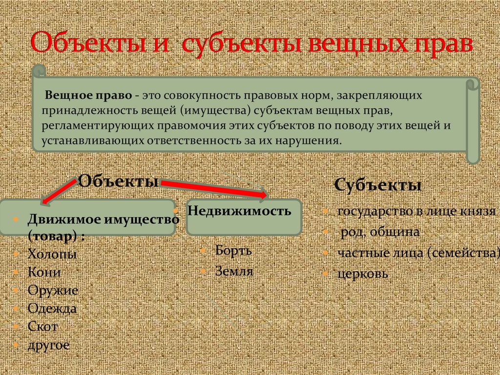 Вещное право - это совокупность правовых норм, закрепляющихпринадлежность вещей (имущества) субъектам вещных прав,