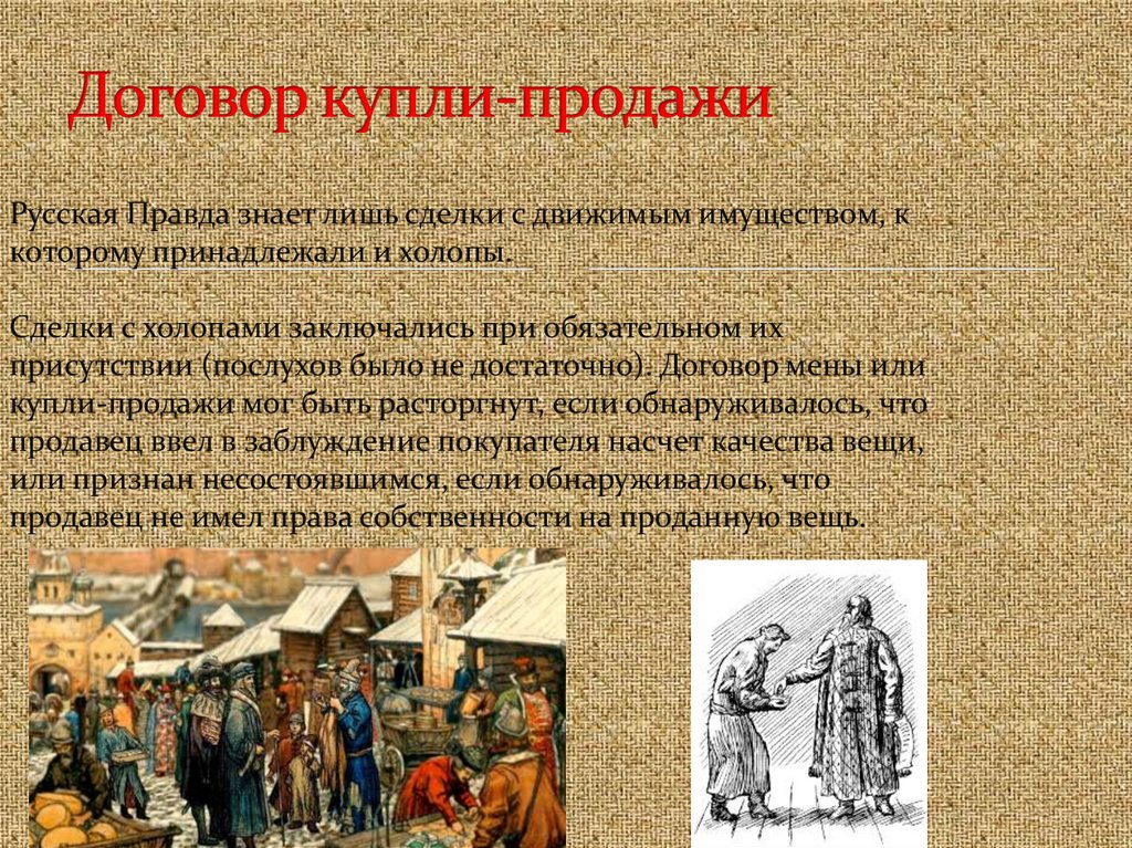 Русская Правда знает лишь сделки с движимым имуществом, ккоторому принадлежали и холопы.