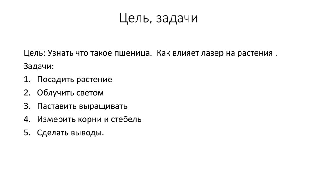 Цель, задачиЦель: Узнать что такое пшеница. Как влияет лазер на растения .
