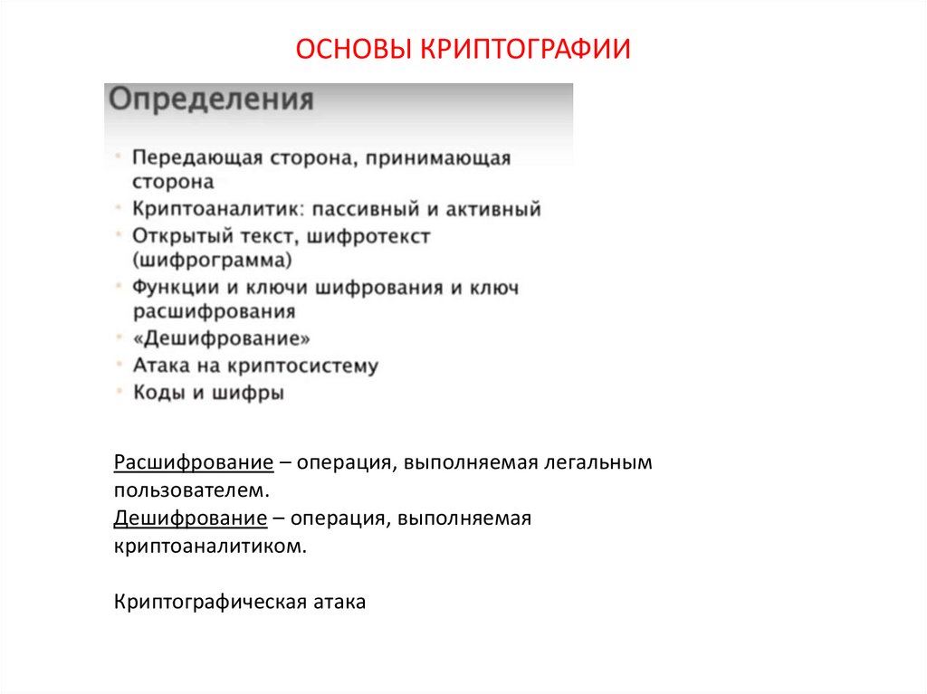 ОСНОВЫ КРИПТОГРАФИИРасшифрование – операция, выполняемая легальным