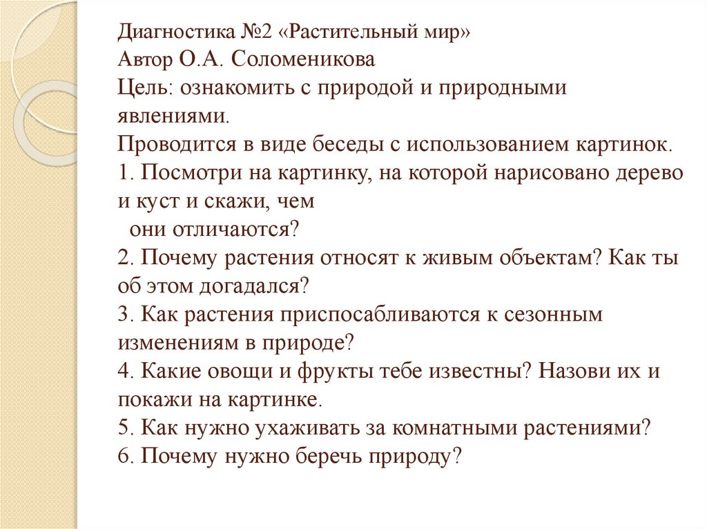 Диагностика №2 «Растительный мир»Автор О.А. Соломеникова