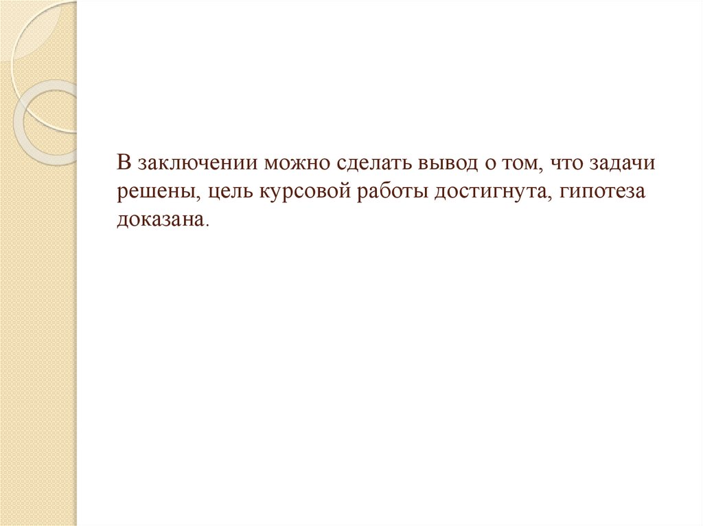 В заключении можно сделать вывод о том, что задачирешены, цель курсовой работы достигнута, гипотеза
