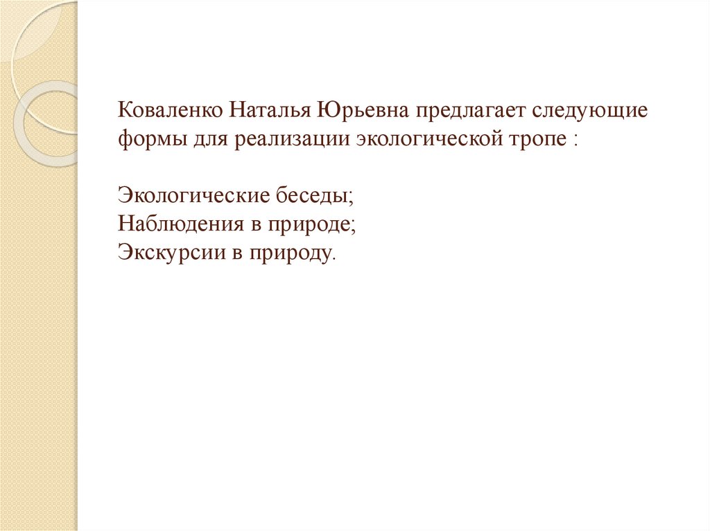 Коваленко Наталья Юрьевна предлагает следующиеформы для реализации экологической тропе :