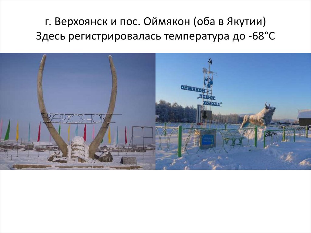 г. Верхоянск и пос. Оймякон (оба в Якутии)Здесь регистрировалась температура до -68°C
